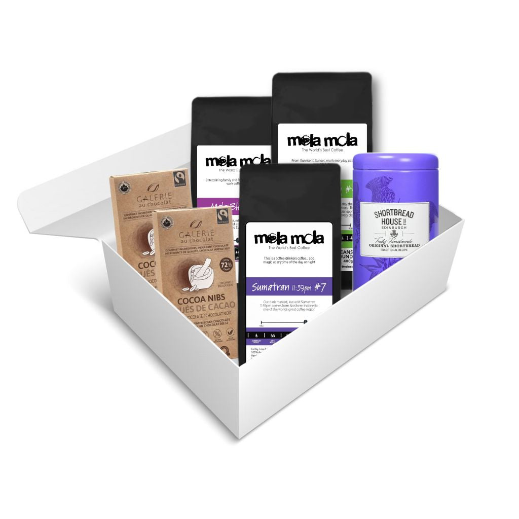 Slide off the top to reveal three of Mola Mola’s fair trade, shade grown and organic coffee, alongside a package of the award winning Shortbread House of Edinburgh cookies. For those who aren’t willing to share these mouthwatering shortbread cookies, we have included four sharing sized organic and fair trade chocolate bars - two milk, and two dark - from Galerie au Chocolate. Each product included in this gift basket, as well as the crate itself, has been chosen for it’s environmentally, and socially upstanding qualities! The recipient will appreciate the sentiment as much as its delicious contents!