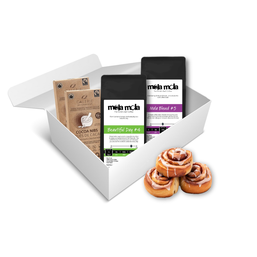 In The Beautiful Day Gift Basket you will find two pounds of Mola Mola’s fair trade, organic and shade grown coffees, one of which will undoubtedly be the Beautiful Day blend! Also included will be a sweet treat from Kingston’s legendary Oomens farmhouse bakery and sharing sized milk and dark chocolate bars from Galerie au Chocolate. The Beautiful Day Gift Basket is delivered in beautifully gift wrapped box accompanied by a personalized message.