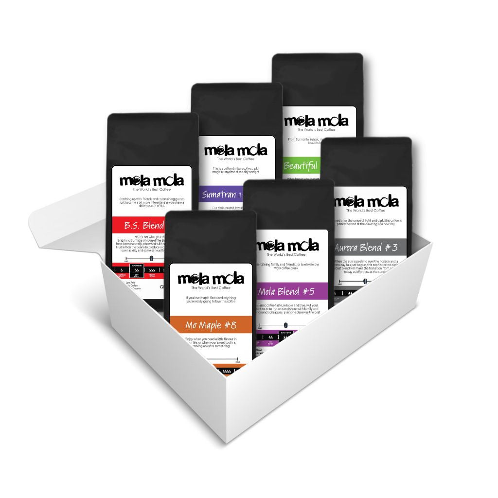 The name of this basket really does say it all, Coffee Coffee! Along with a personalized letter, this beautifully wrapped gift basket includes six of Mola Mola’s signature coffees. That’s six pounds of fair trade, artisan roasted, organic coffee! This is the ideal gift for the coffee connoisseur in your life. What better way is there to say “Thank You!” to those people who have made your life better than the Coffee Coffee Gift Basket? Perhaps, you would like to express your sincere appreciation to your team of doctors and nurses after a hospital stay, the administration staff at your office, or your Real Estate agent after the sale of your house. On the other hand, who needs an occasion for fantastic coffee?